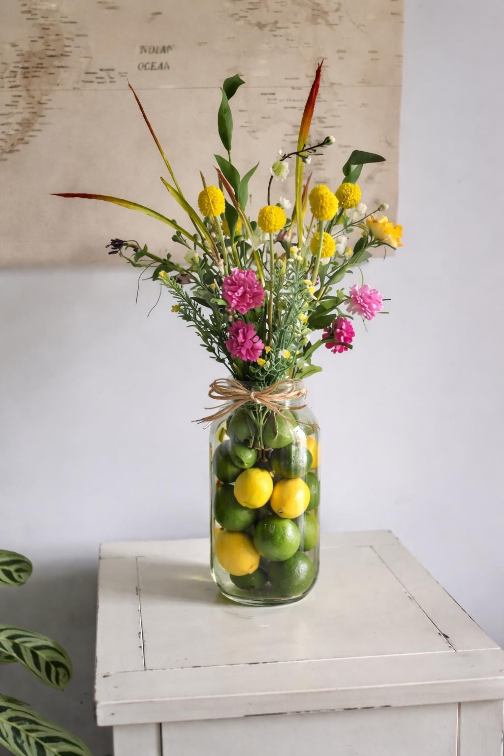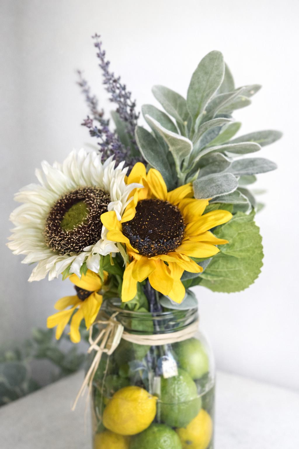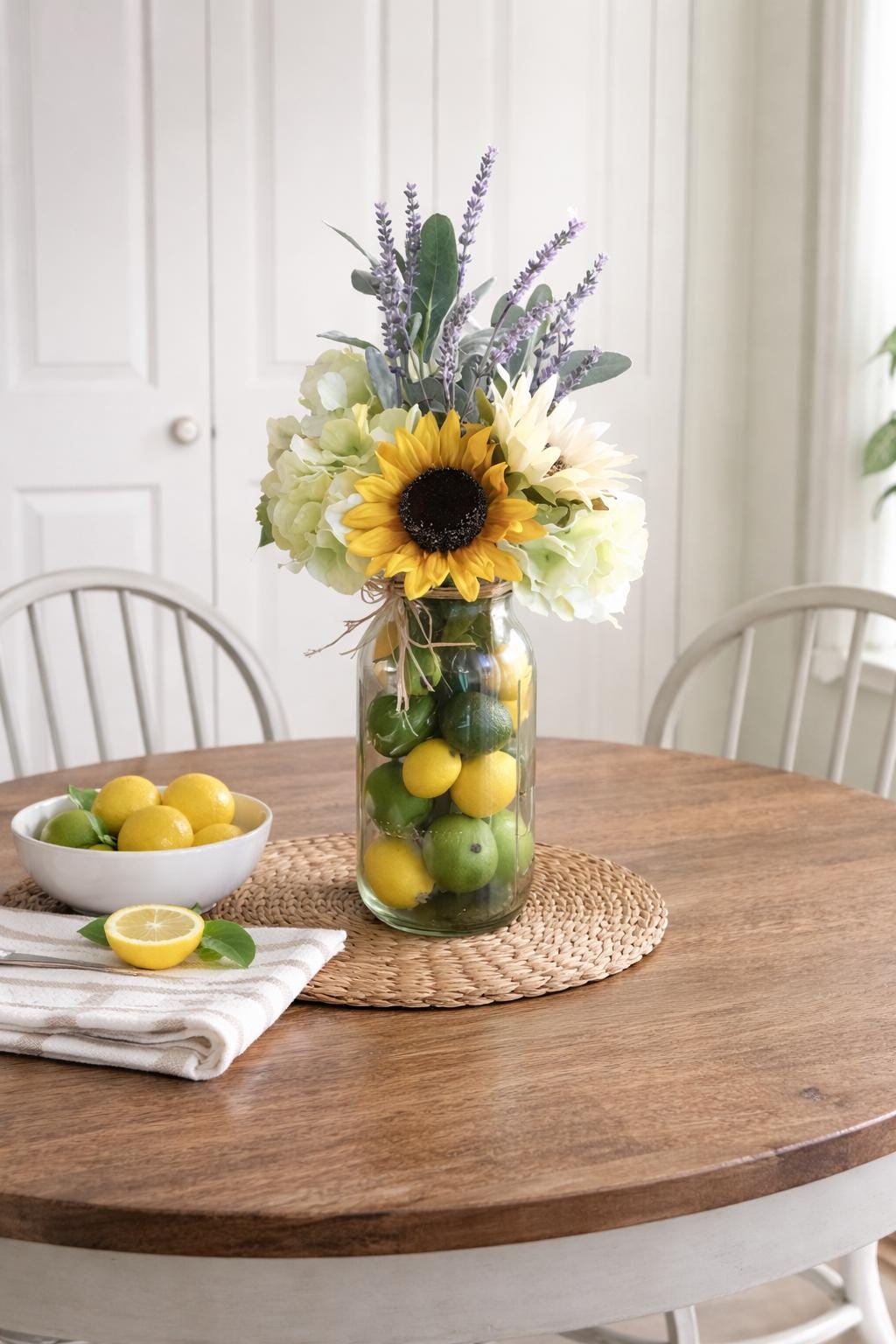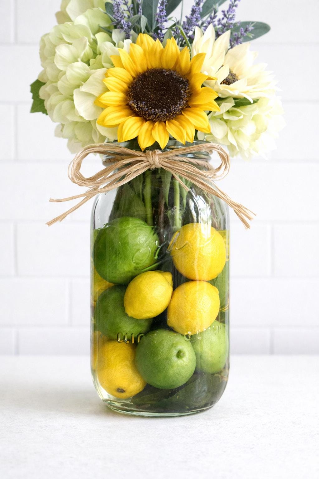 Brighten your home with this cheerful farmhouse floral arrangement featuring vibrant sunflowers and wildflowers arranged in a large glass mason jar filled with realistic lemons, limes, green apples, and pears.