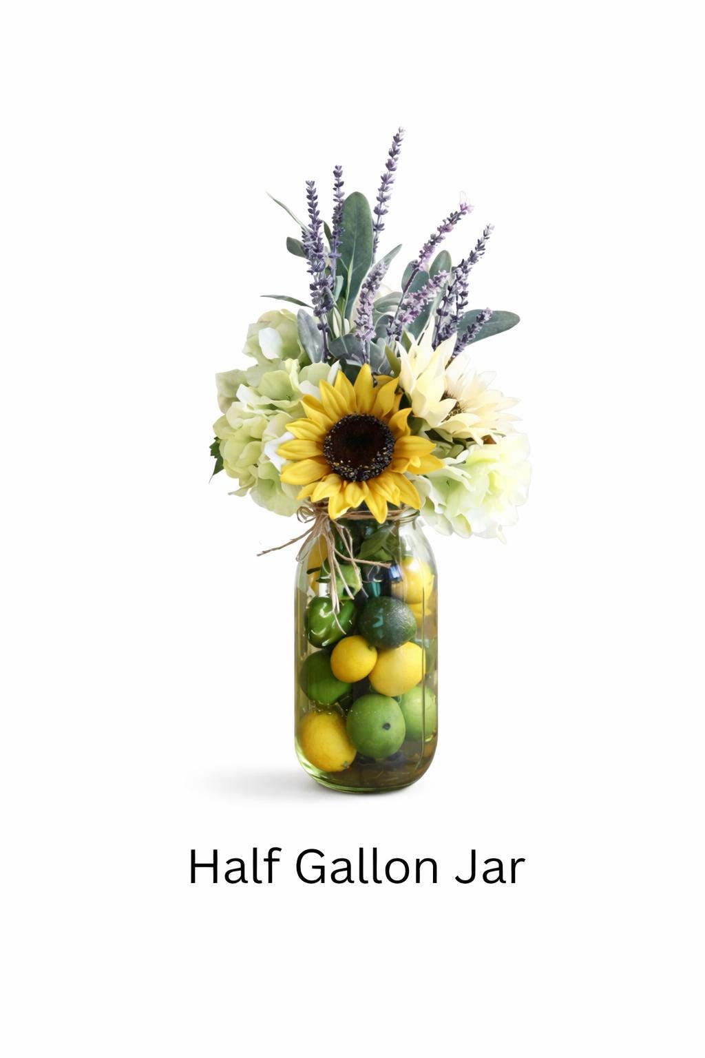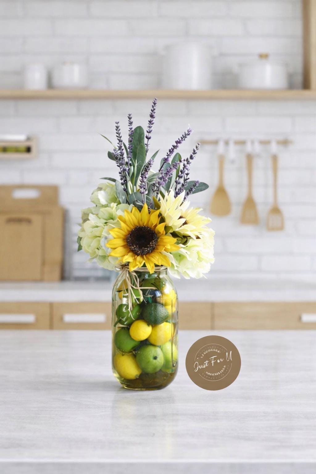 Bring cozy farmhouse charm to your home with this handcrafted faux floral centerpiece. Arranged in a clear glass jar filled with decorative lemons and greenery, this piece adds warmth and color to kitchens, dining tables, coffee bars, and entryways β with no maintenance needed.