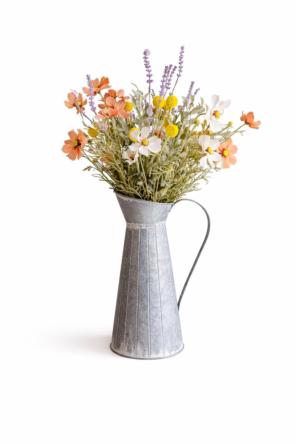 Bring soft farmhouse charm to your home with this beautiful artificial wildflower bouquet. Designed with peach cosmos, white daisies, lavender stems, and bright yellow billy ball flowers, this arrangement adds a natural, fresh look without any maintenance.