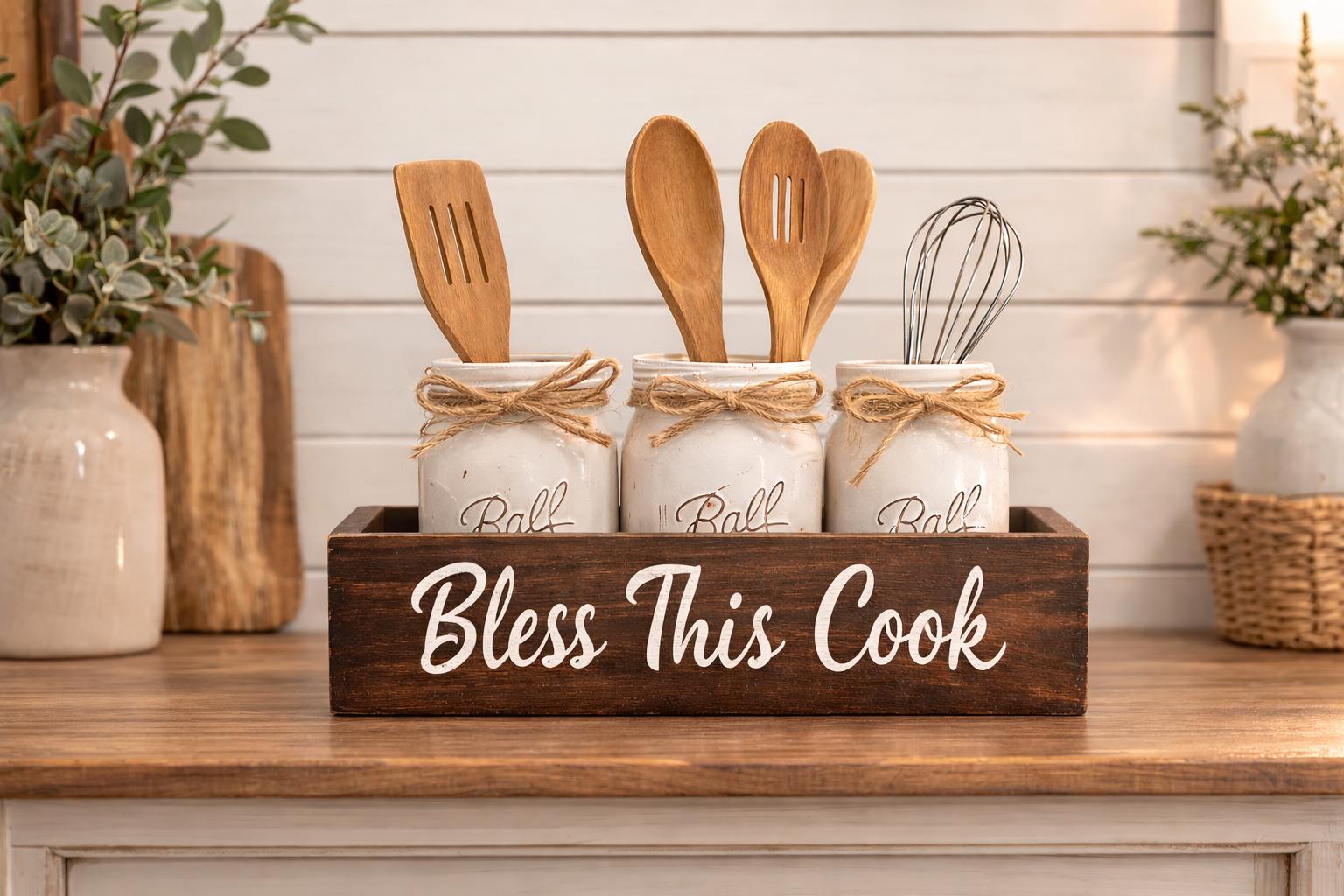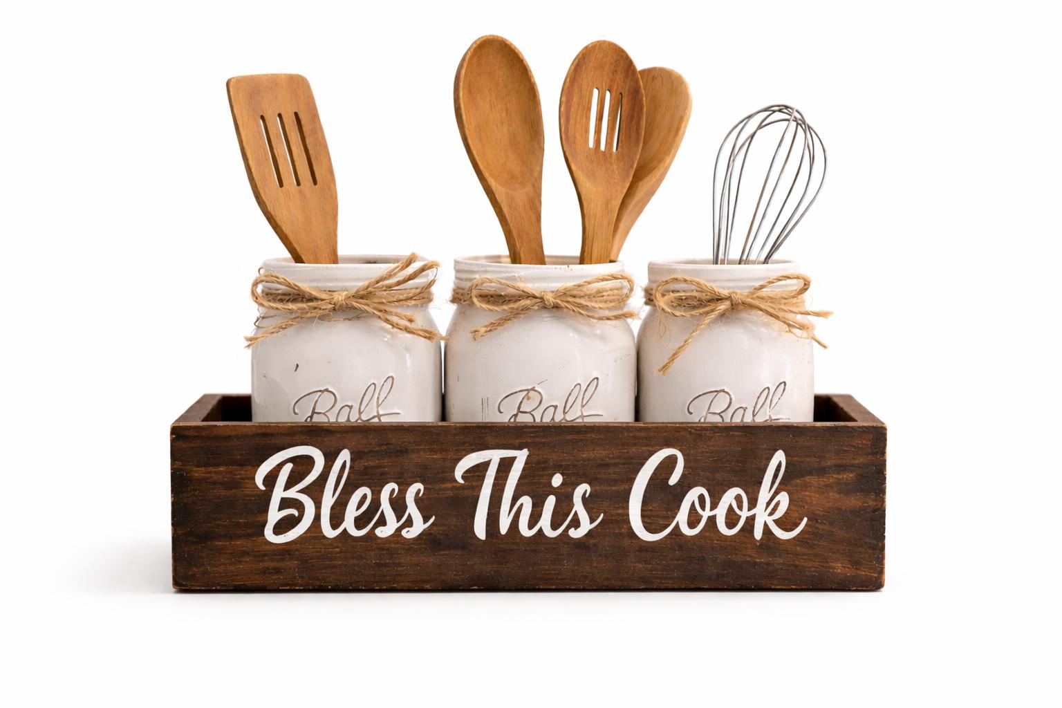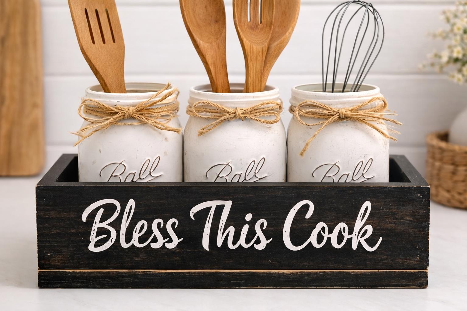 Add rustic farmhouse charm to your kitchen with this handcrafted mason jar utensil holder box featuring the phrase “Bless This Cook.” Perfect for organizing cooking utensils while adding warm farmhouse style to your kitchen counter, island, or coffee bar.
