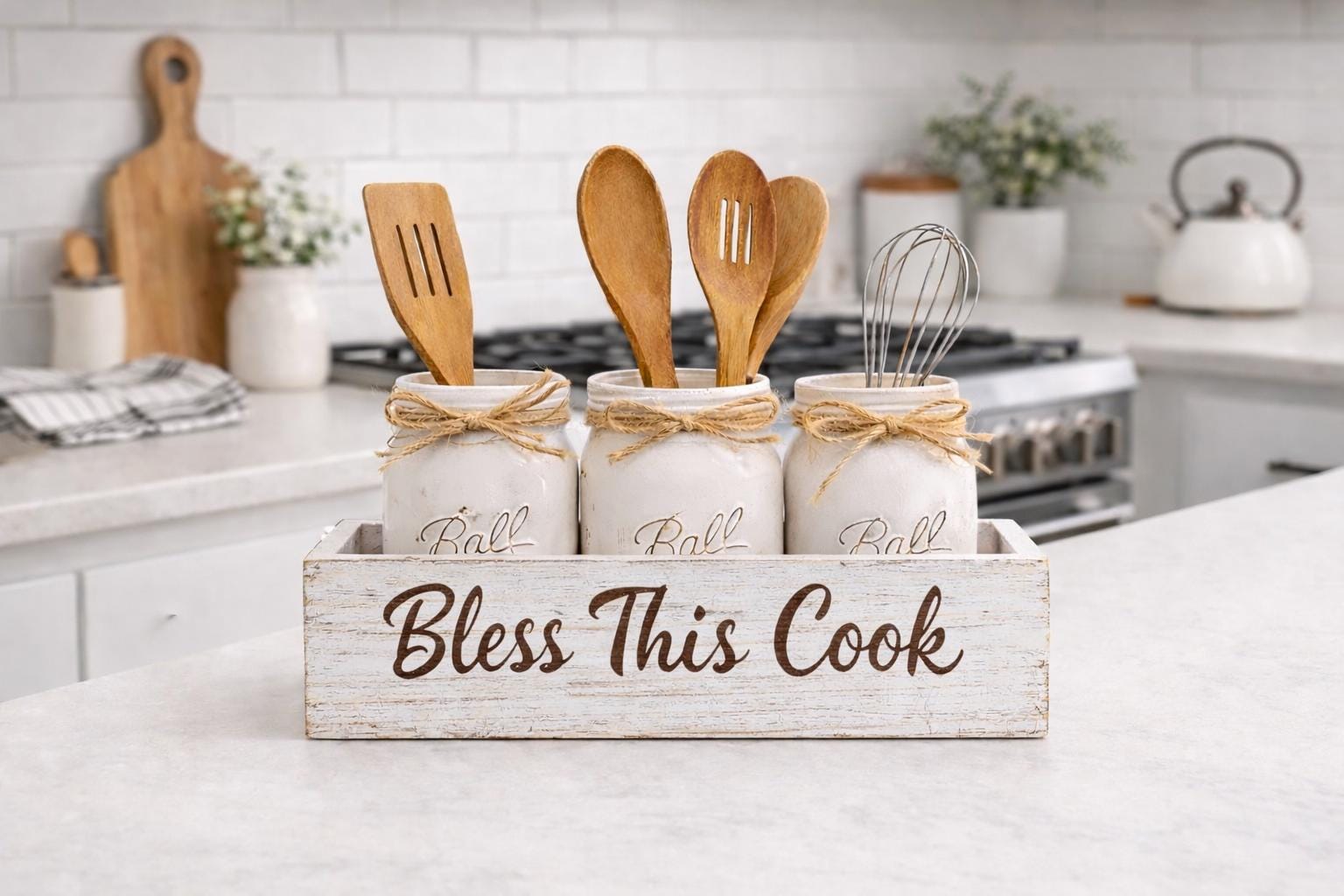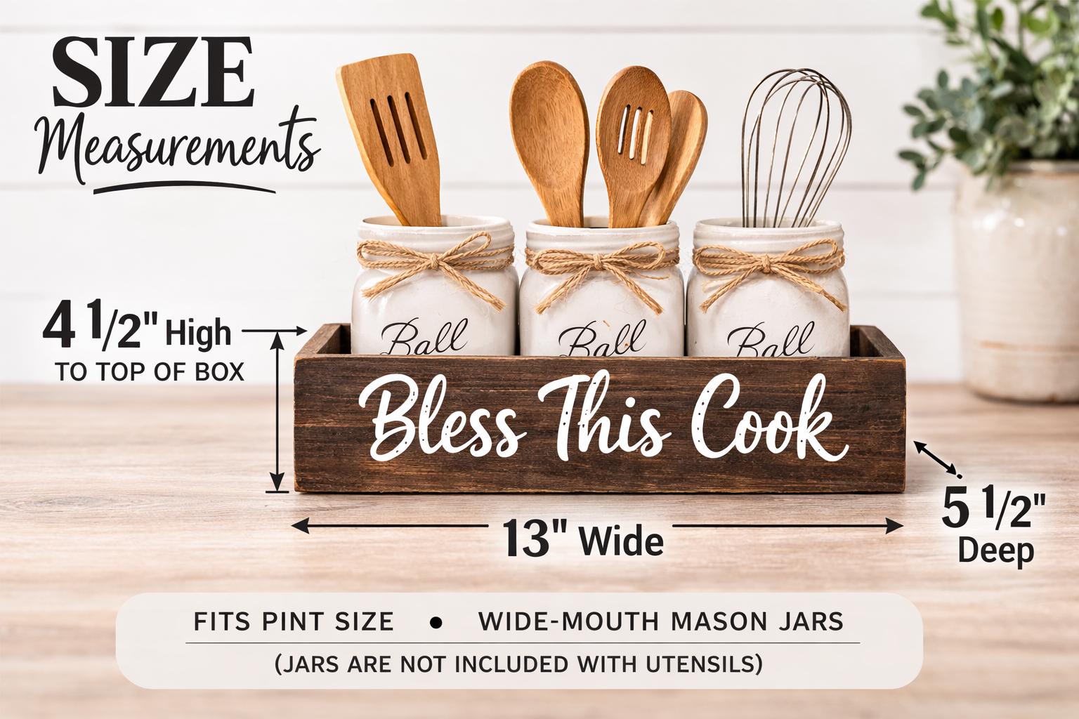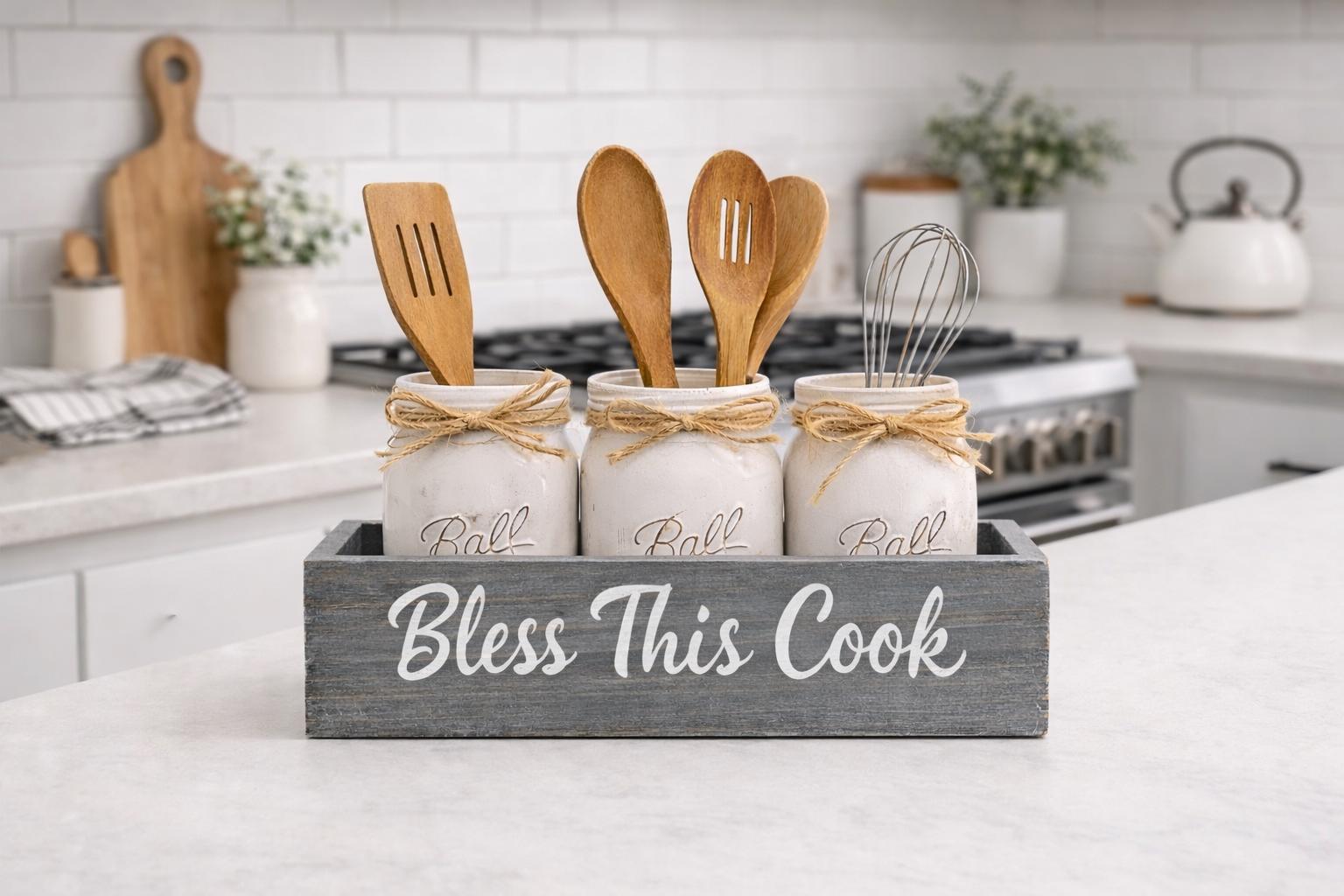 Add rustic farmhouse charm to your kitchen with this handcrafted mason jar utensil holder box featuring the phrase “Bless This Cook.” Perfect for organizing cooking utensils while adding warm farmhouse style to your kitchen counter, island, or coffee bar.