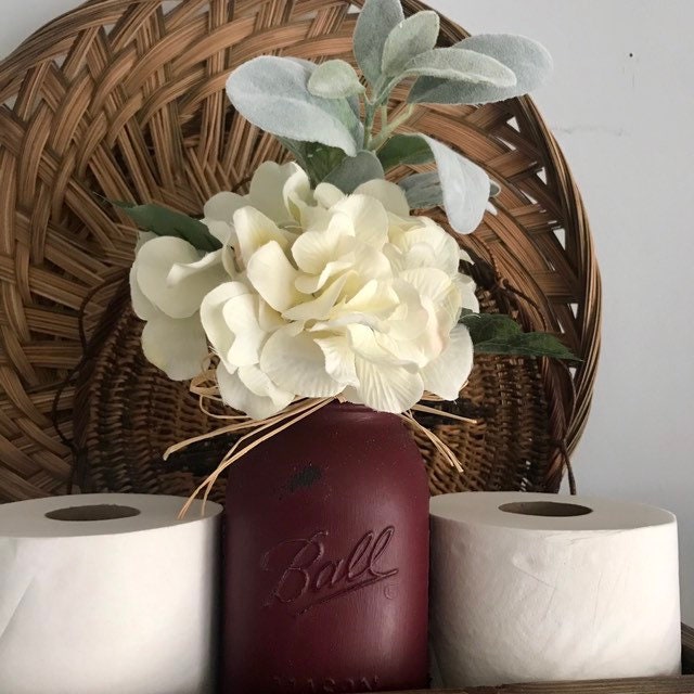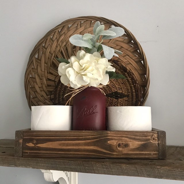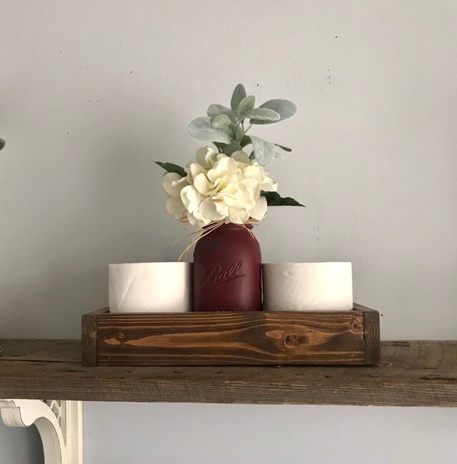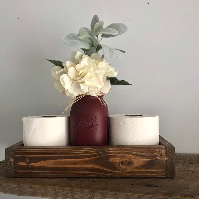 Perfect Bathroom organizer wooden tray toilet paper holder. The bath tray comes with a mason jar with hydrangea and lambs ear. This wooden stained tray can come blank with no wording or you can customize with your own wording. Make it a funny bathroom sign by adding your own. Rustic tray will hold two rolls of tissue paper and one hand painted mason jar for a rustic decor. If you are looking for the perfect housewarming gift this is it. Great for bathroom storage