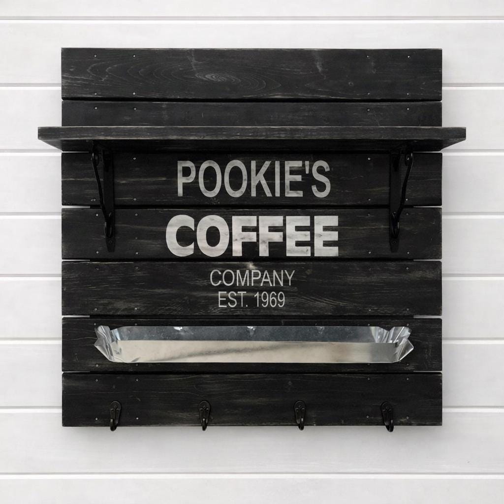 Create a stylish and organized coffee space with this handmade personalized coffee bar shelf. Designed with a sturdy wood shelf and hooks, it’s perfect for mugs, towels, or coffee essentials while adding farmhouse homeware charm to your kitchen.