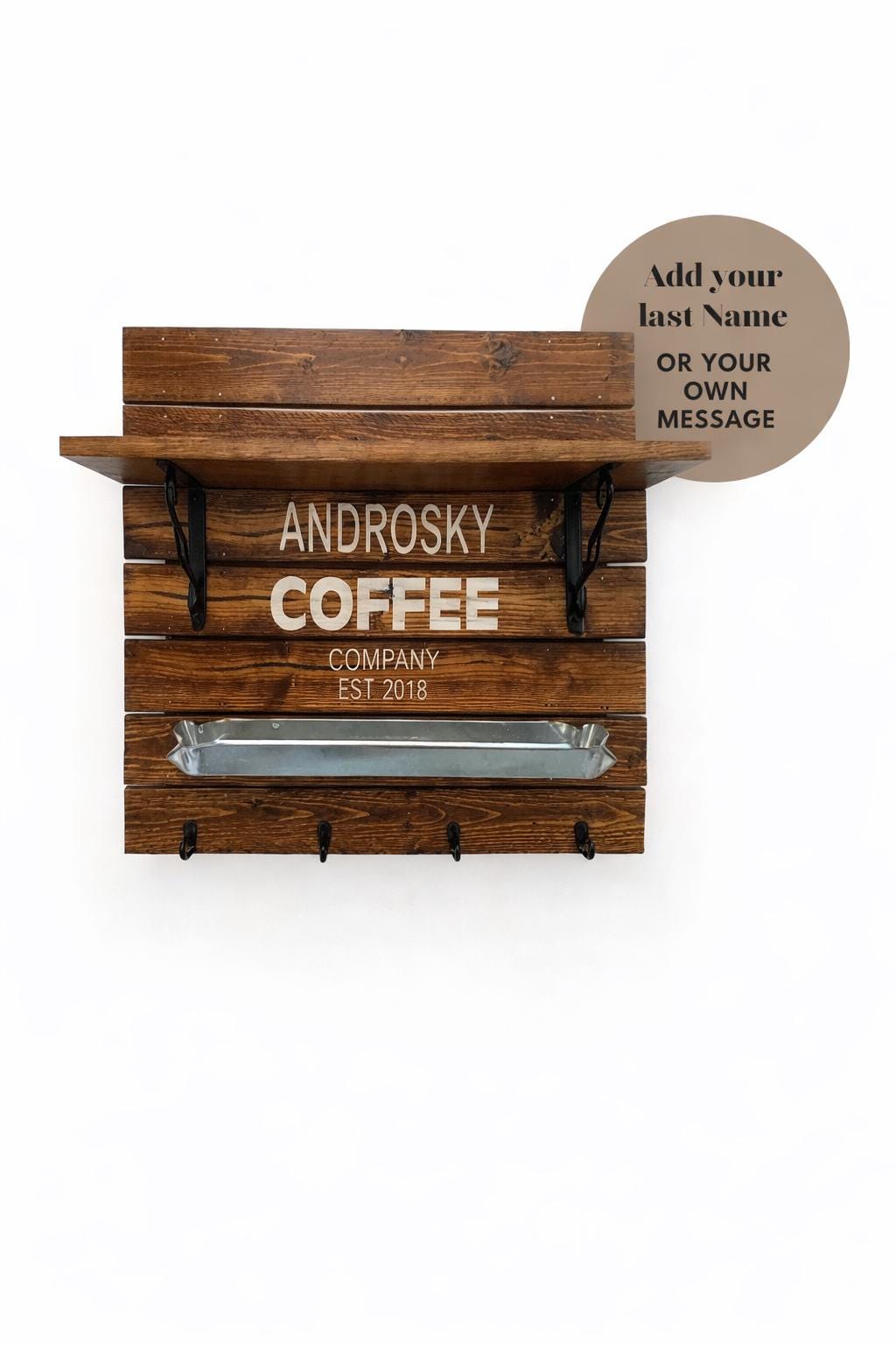 Each coffee bar is custom made with your family name or wording, making it a unique statement piece or a thoughtful personalized gift.