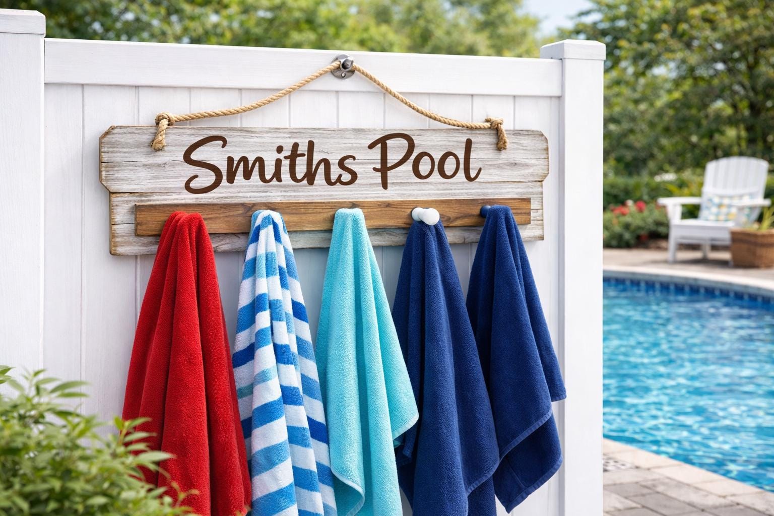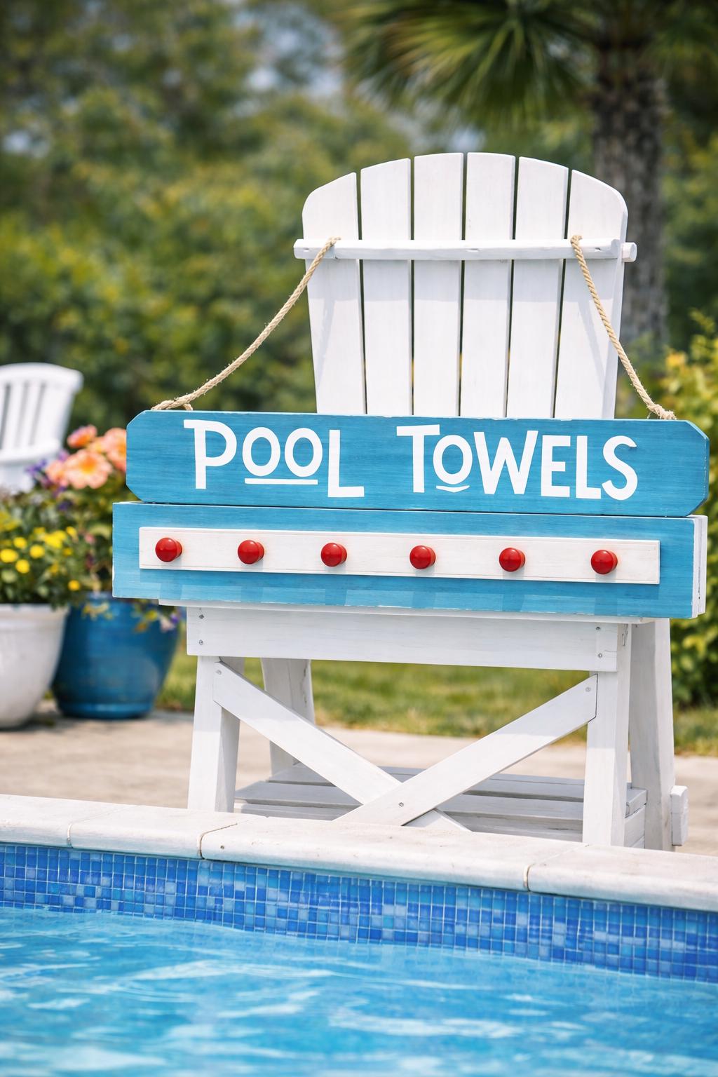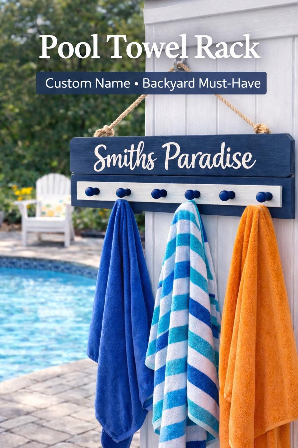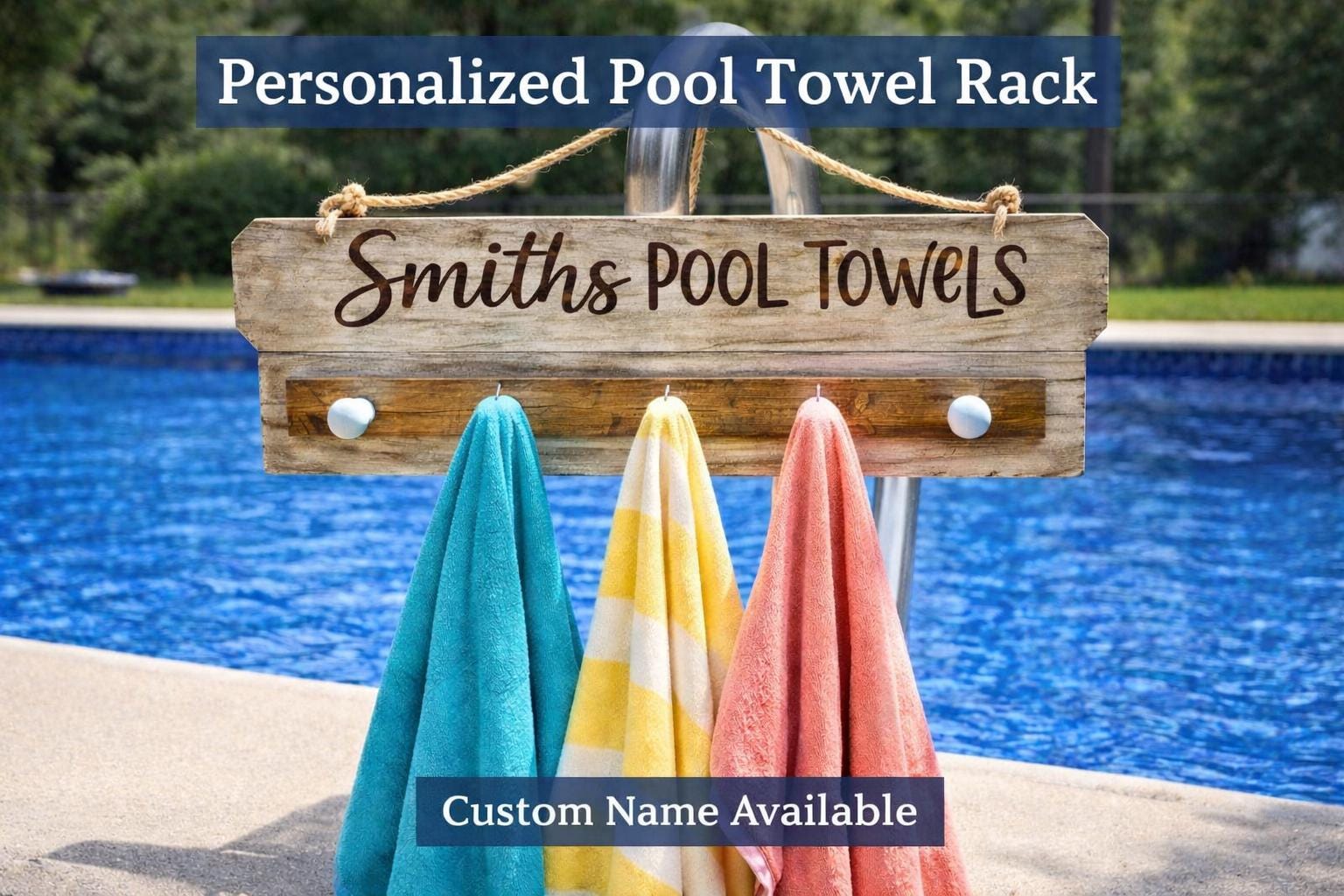 Add a stylish and functional touch to your poolside with this personalized pool towel rack—perfect for keeping towels organized while adding a custom look to your outdoor space.