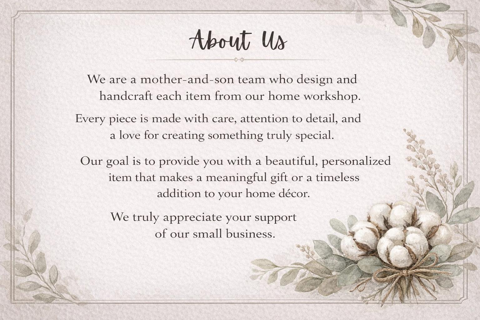 Each item is handcrafted in our home workshop with attention to detail. We take pride in creating personalized pieces that make your home feel warm and welcoming.