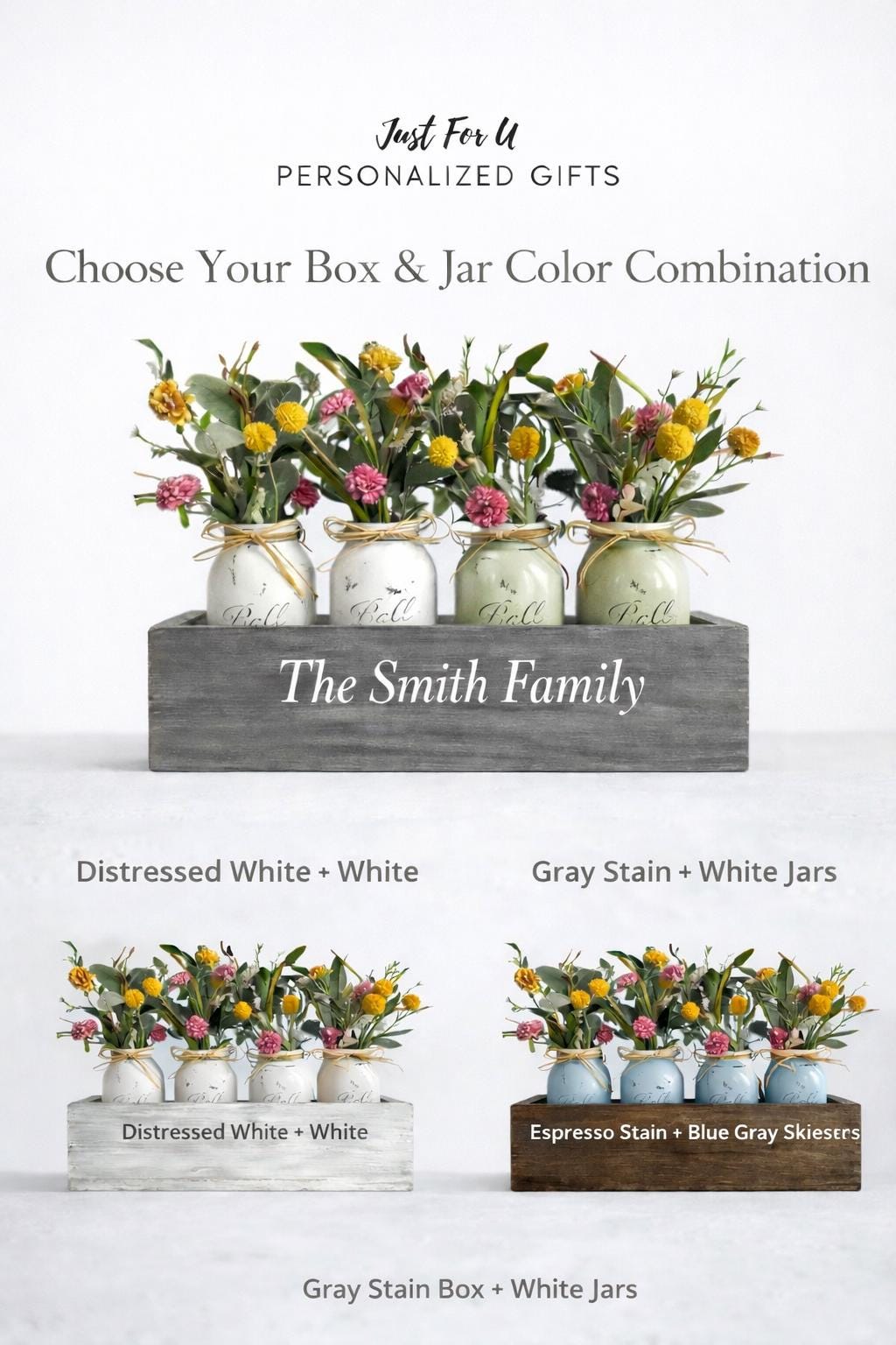 Add a beautiful farmhouse touch to your home with this handcrafted mason jar centerpiece box or just flowers and jars. You have options. This rustic wood box looks perfect on a dining table, kitchen island, coffee table, or fireplace mantel. Personalize the front with your family name or a custom phrase to make it truly special.