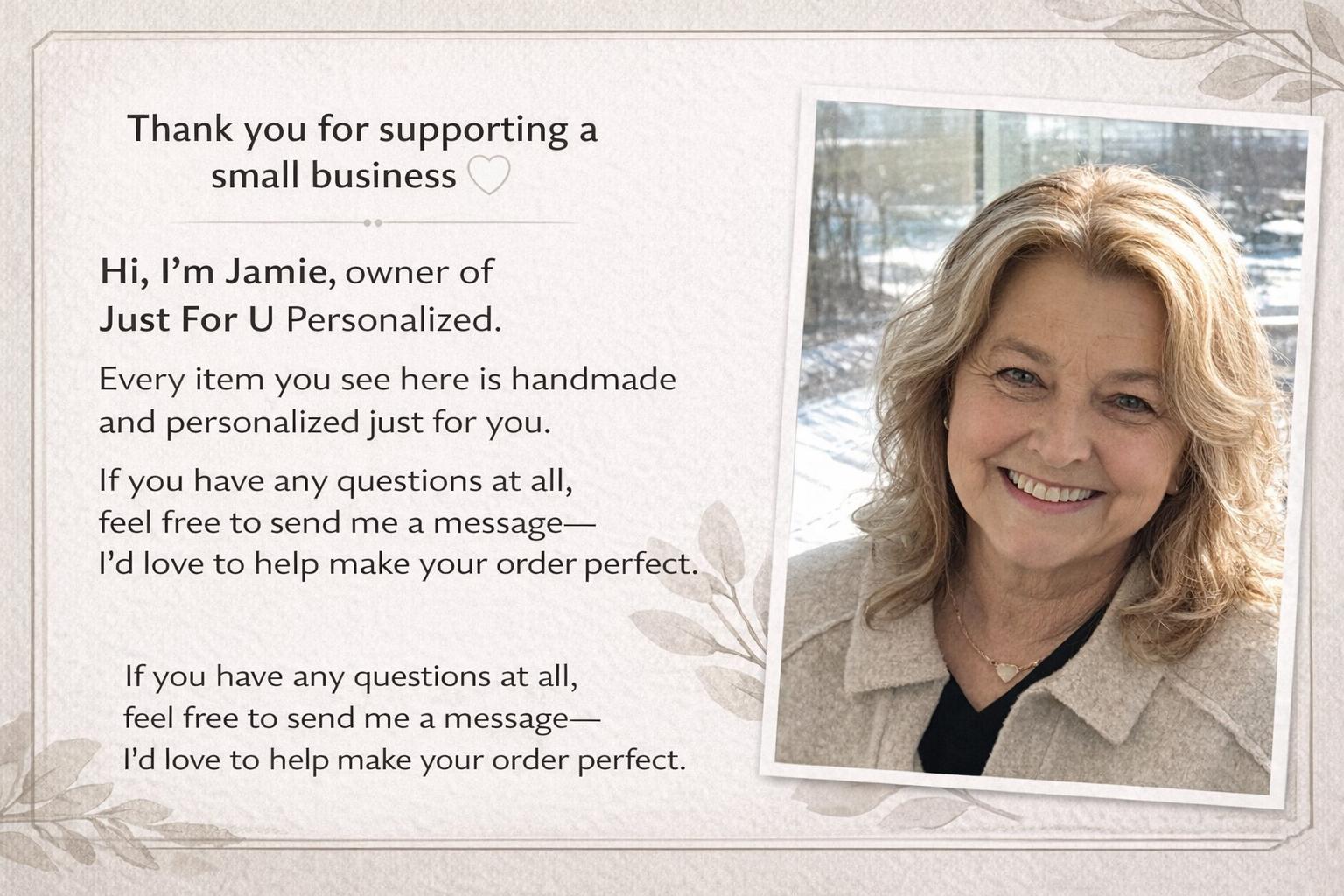 We are a mother-and-son team creating personalized pieces from our home workshop. Every item is crafted with care to make your space feel special.