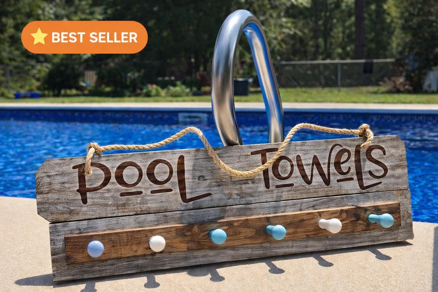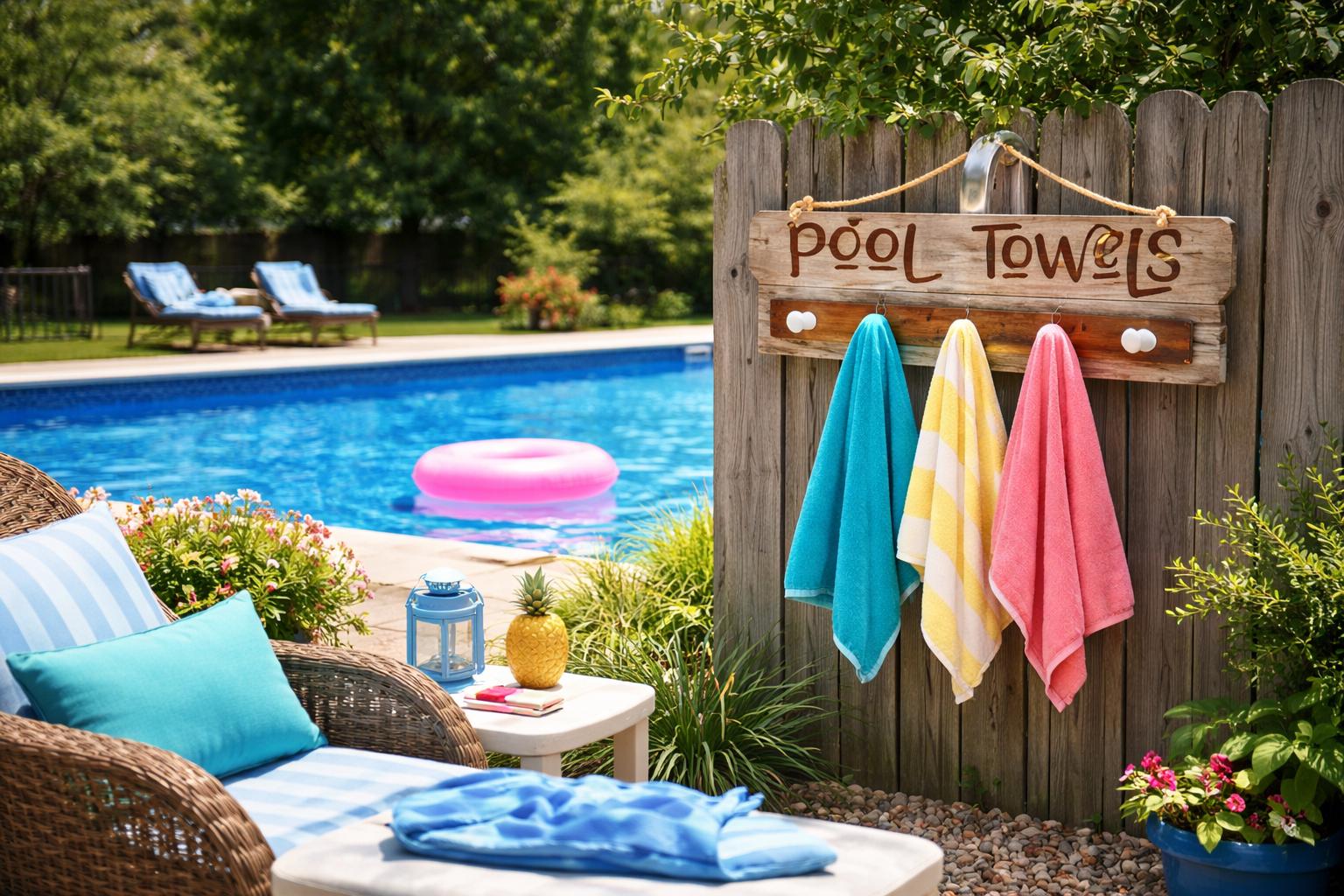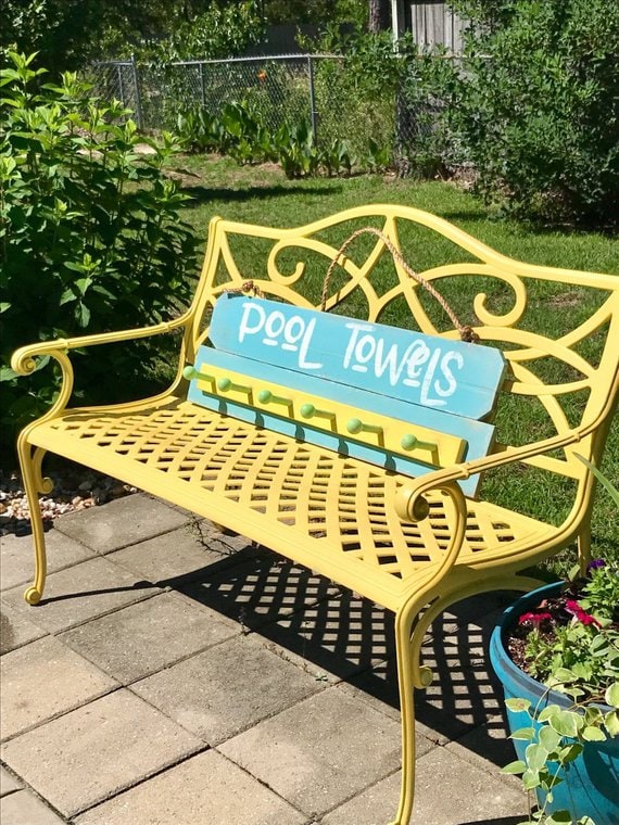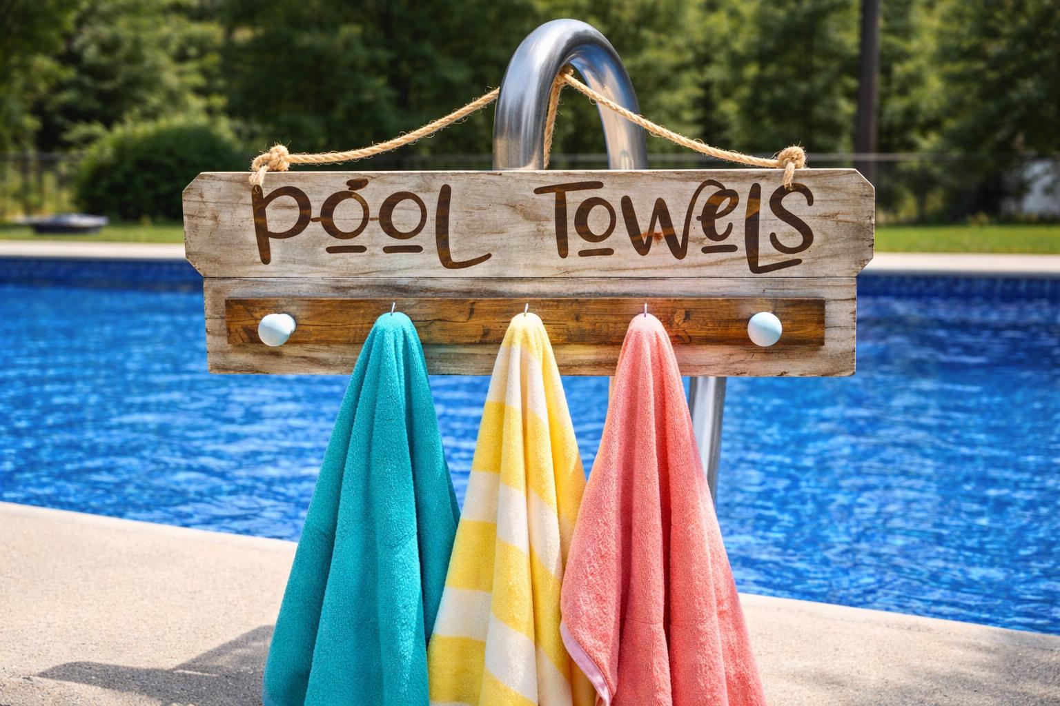 Pool towel holder with hooks, personalized pool sign, and outdoor towel rack for your backyard pool or hot tub area.