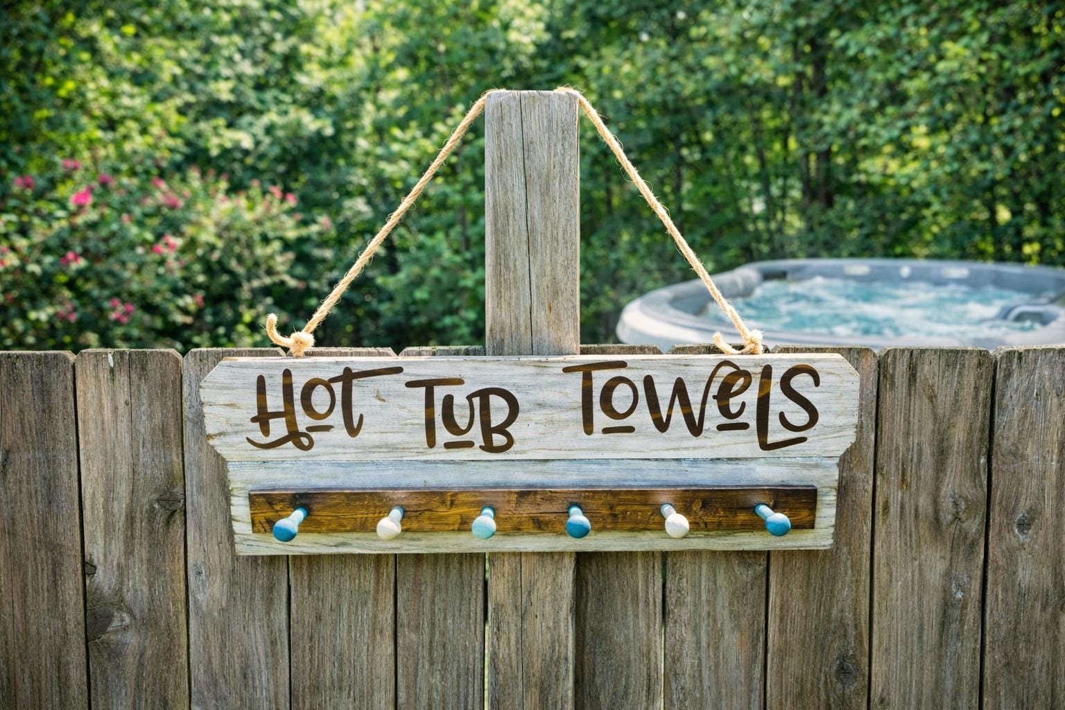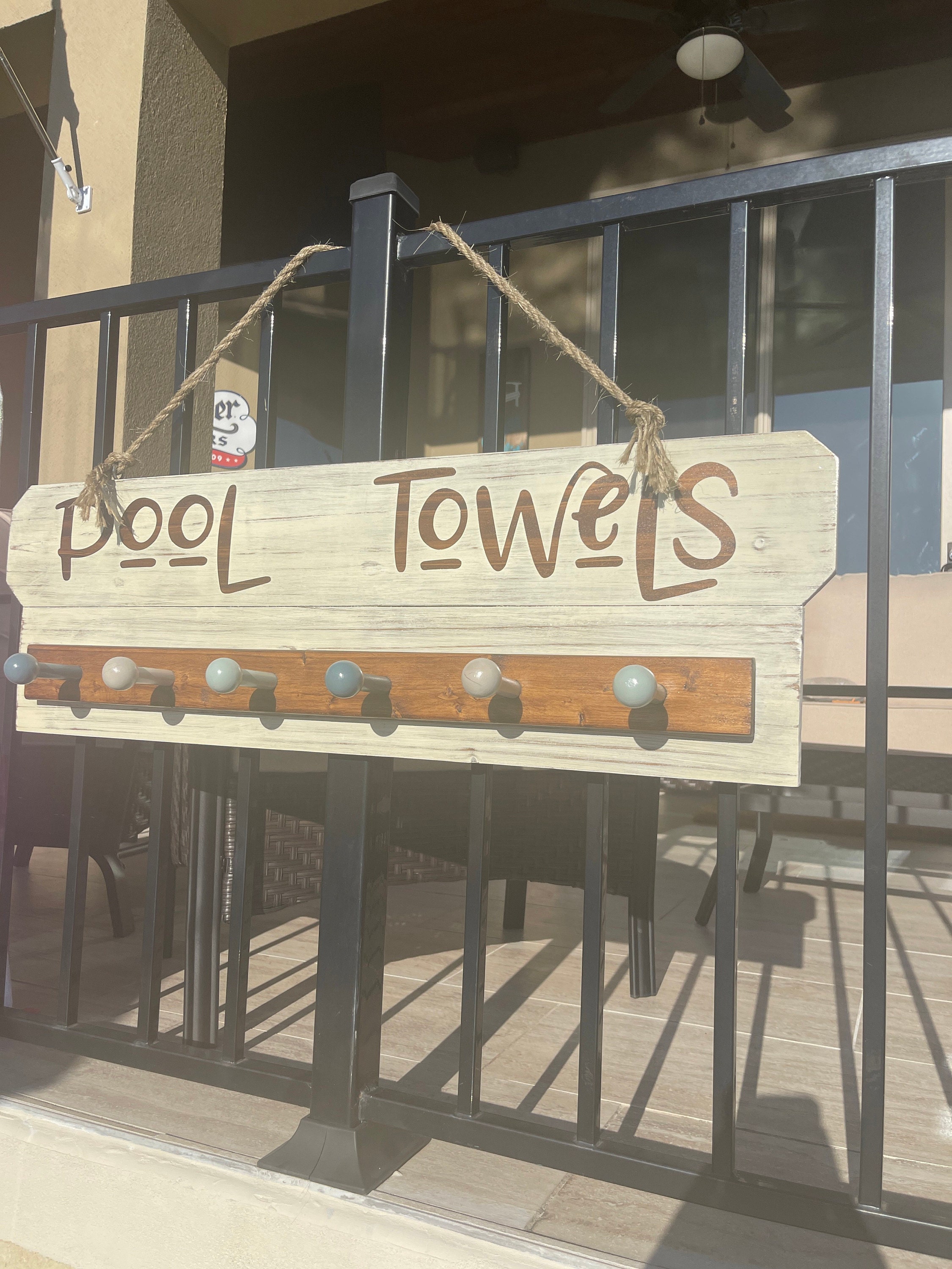 You are welcome to personalize it with any saying. (Just keep in mind if the saying is longer letters will be smaller) Just send us a message and we can let you know if your saying will work. Pool towel rack comes with a burlap rope and two hooks on back for secure hanging.