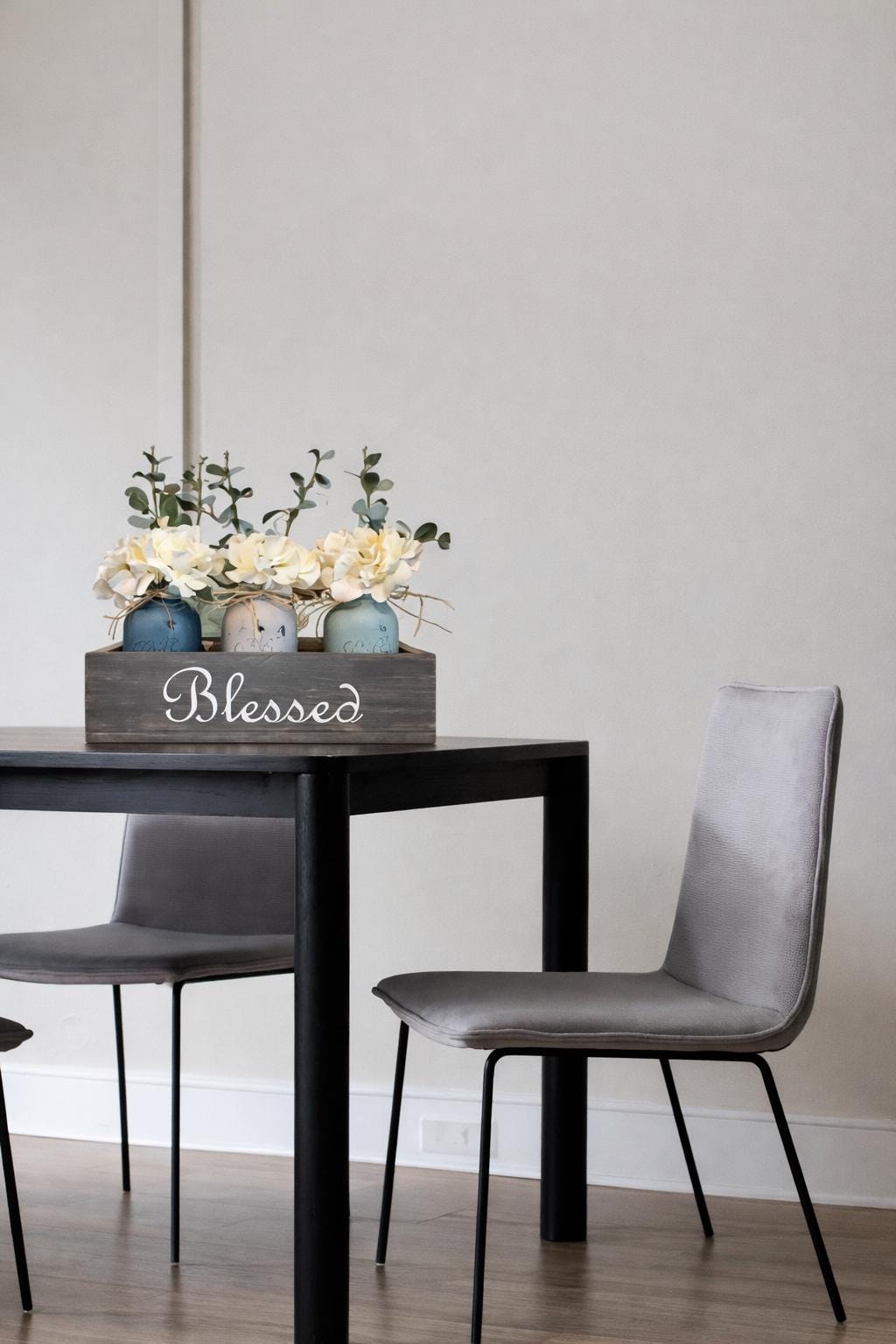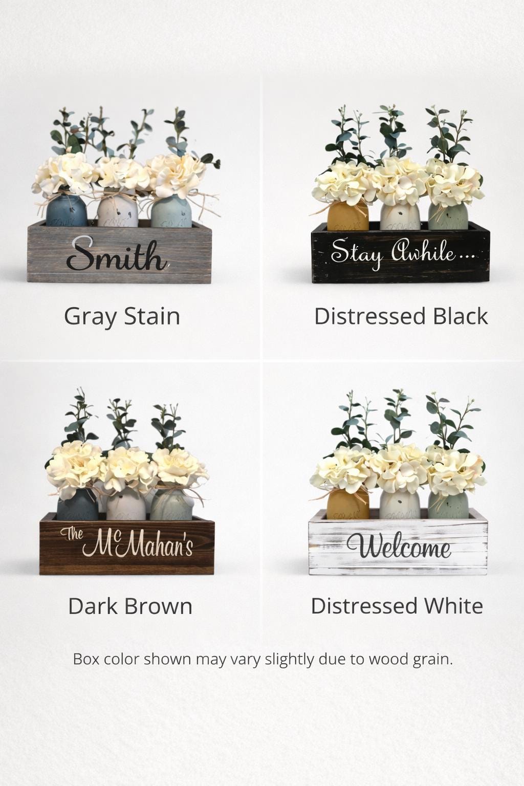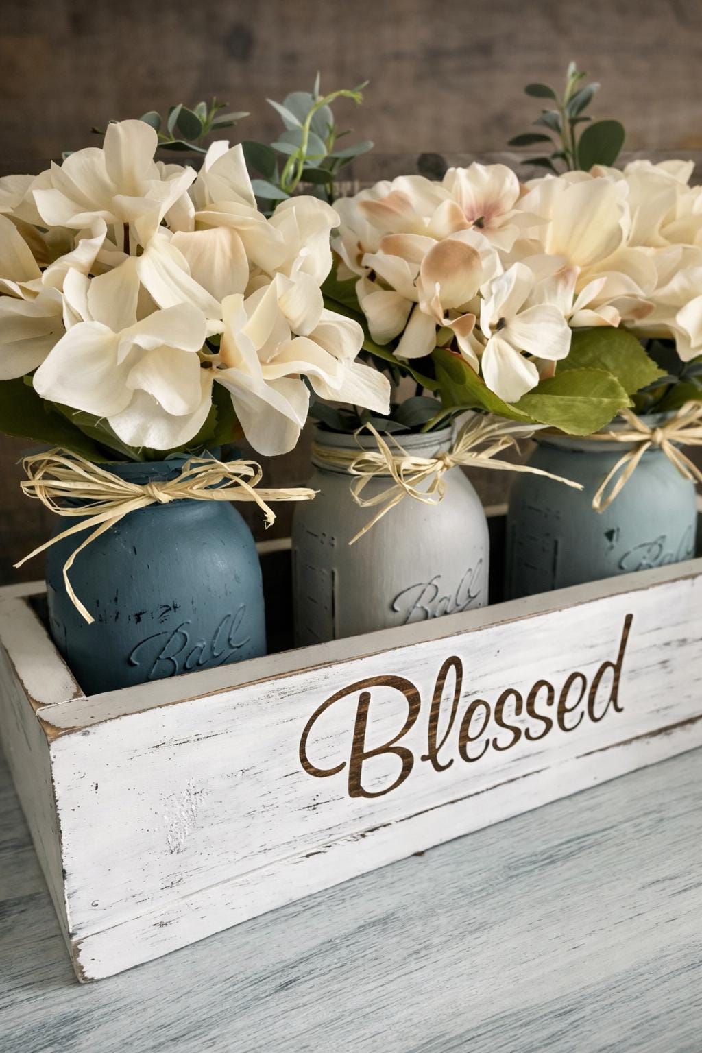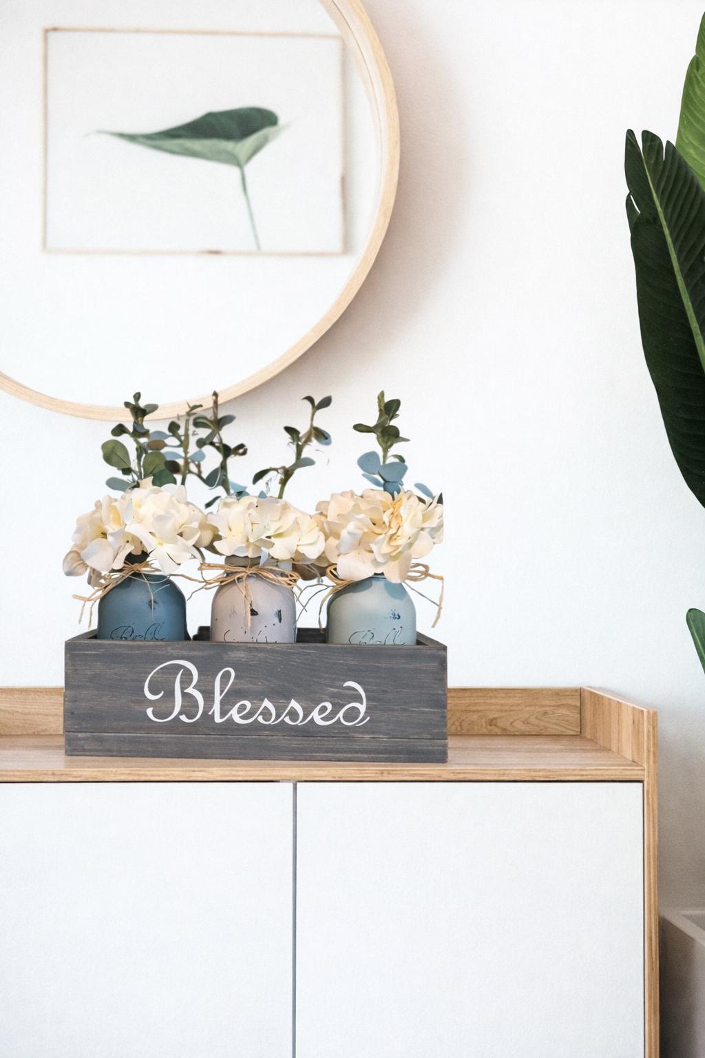 Featuring a solid wood box with three hand-painted mason jars filled with realistic florals, this centerpiece is perfect for a dining table, kitchen island, entryway, or bathroom vanity.