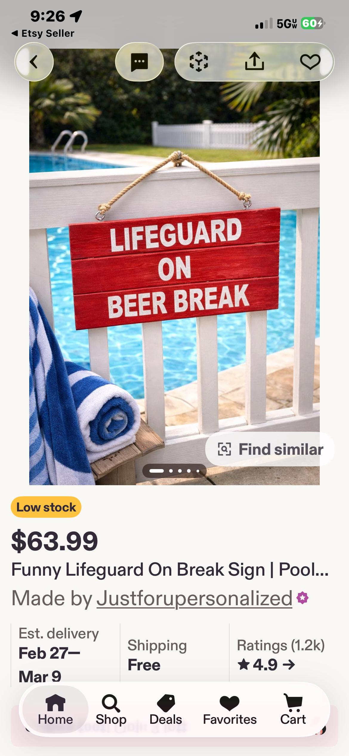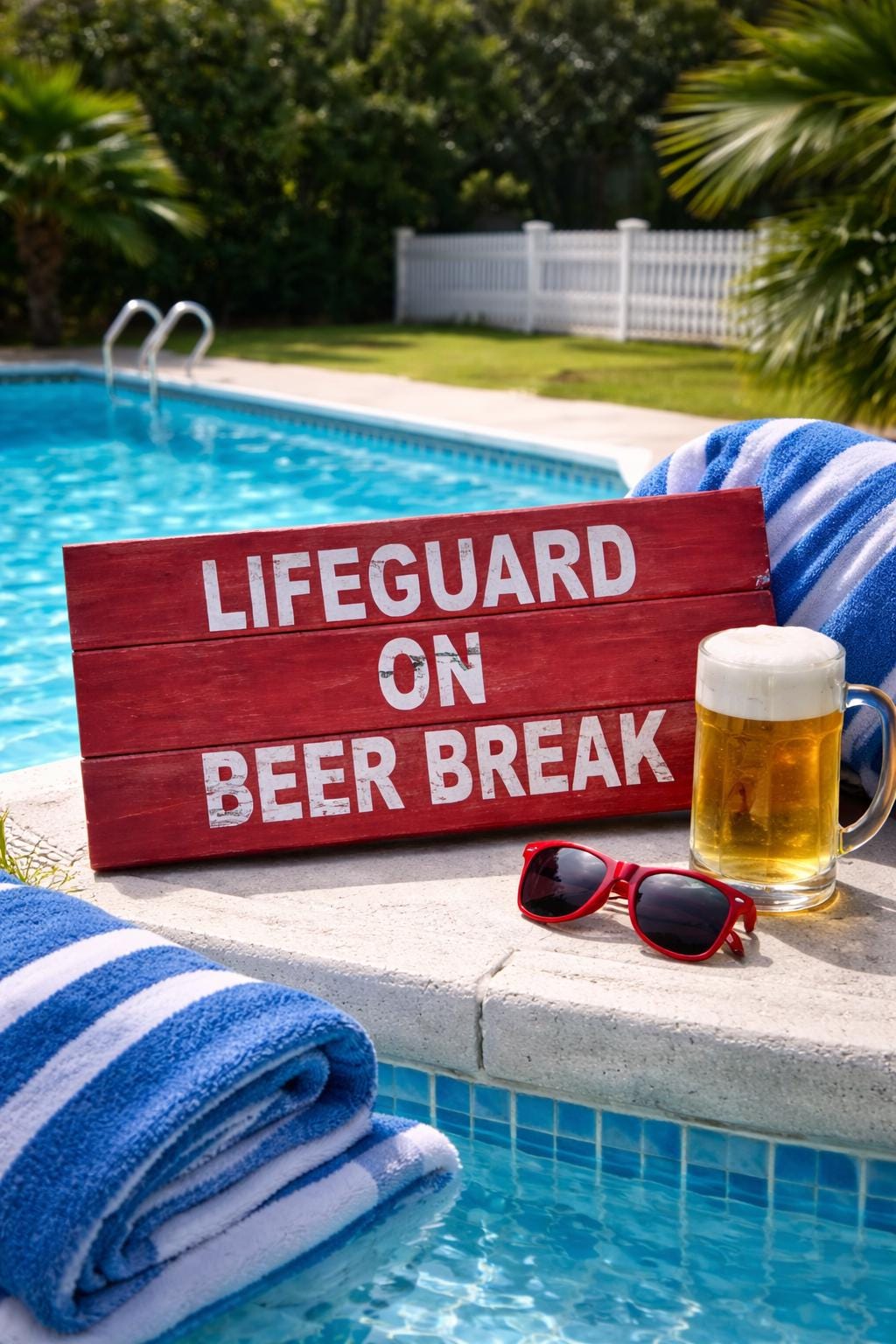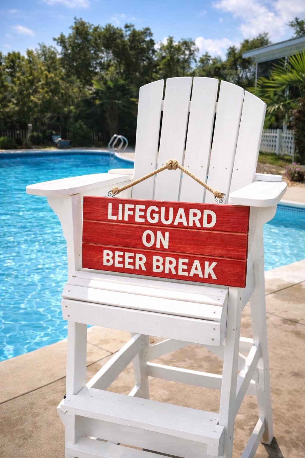 Pool sign adds a little humor to your swimming pool, with this wood sign. Pool decorations for summer. Decorate your pool with this rustic distressed lifeguard sign. Yes its that time again. You have worked so hard on that farmhouse rustic theme inside your home, now bring it outside to your swimming pool. Your guest will get a kick out of this Lifeguard sign. Lifeguard on beer break.