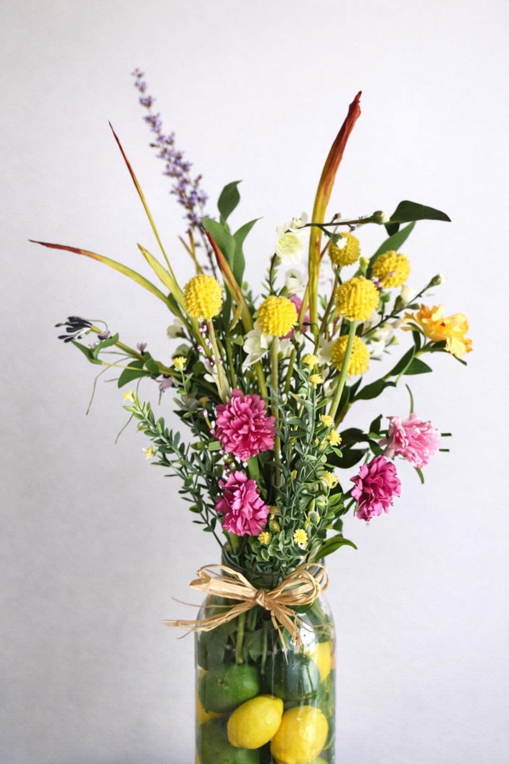 One large Glass mason jar vase filled lemons, limes, green apple and pears. And a colorful wildflower arrangement