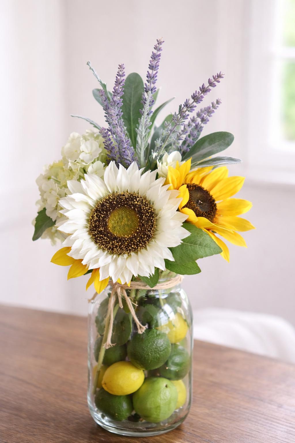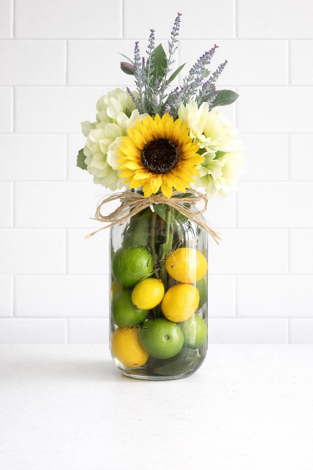 Lemon Centerpiece for kitchen comes with Sunflowers or wildflowers to give your Kitchen Decor a fresh airy arrangement. “Perfect for spring and summer decorating.”This Lemon Table Decor centerpiece will add color to any kitchen or dining room. Order in a Sunflower Arrangement or the wildflowers. Makes a perfect Farmhouse Table Decoration Arrangement.
